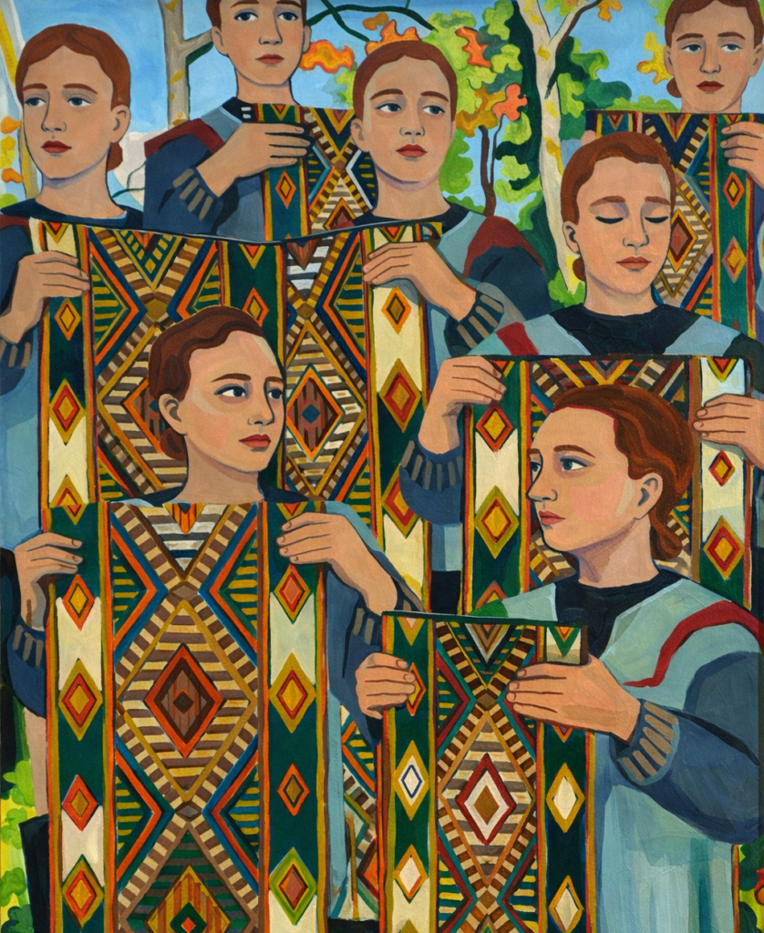 Woman with Textiles, 24×30″ Acrylic, 2023